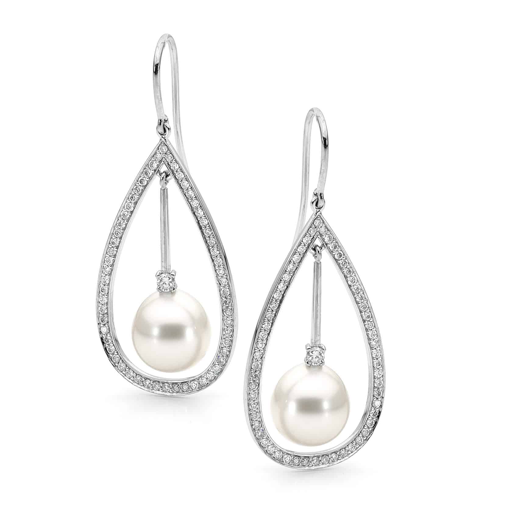 These stunning Pear shaped drop earrings feature two Australian South Sea Pearls surrounded by round brilliant diamonds set in 18ct White gold. These earrings are one to pass down from generation to generation.